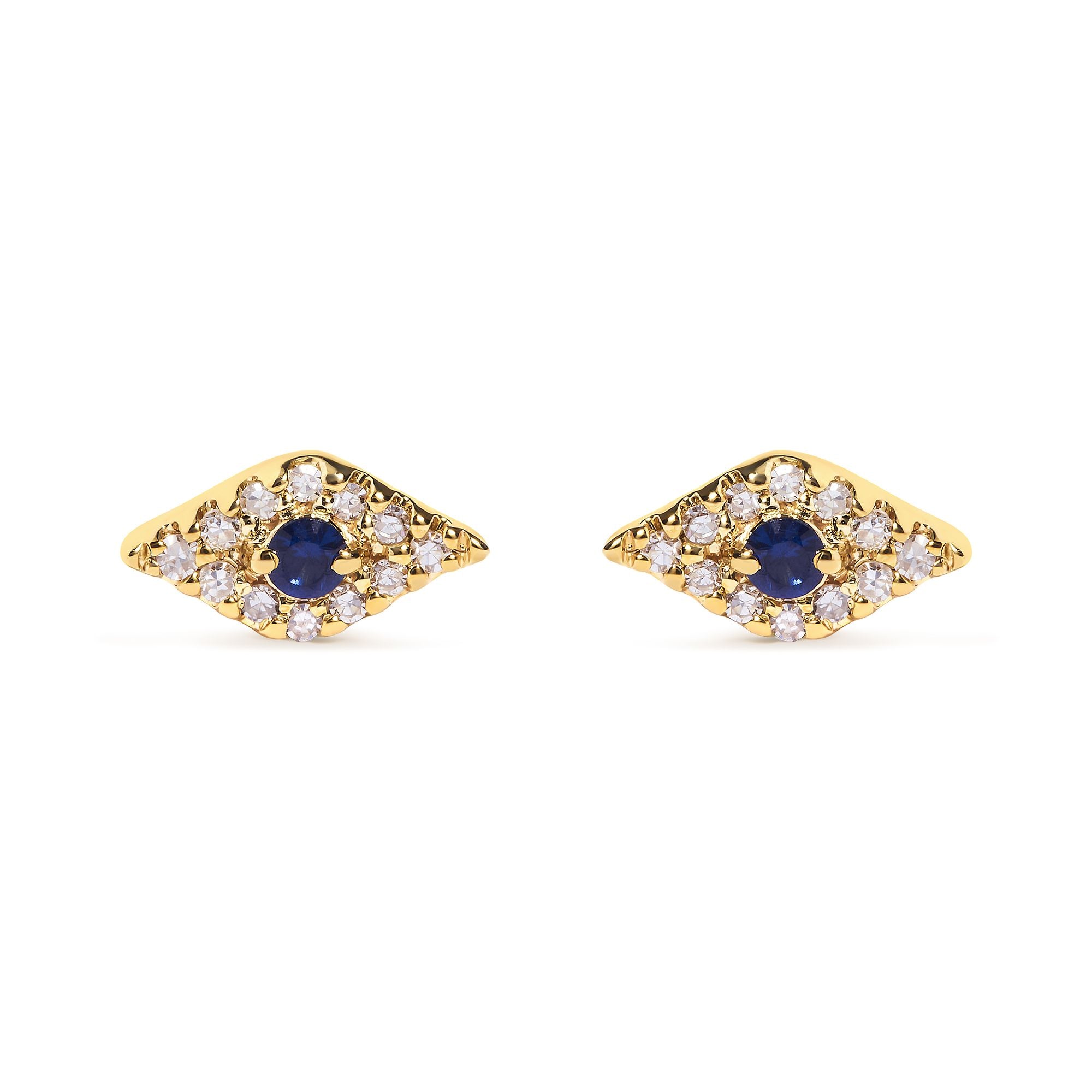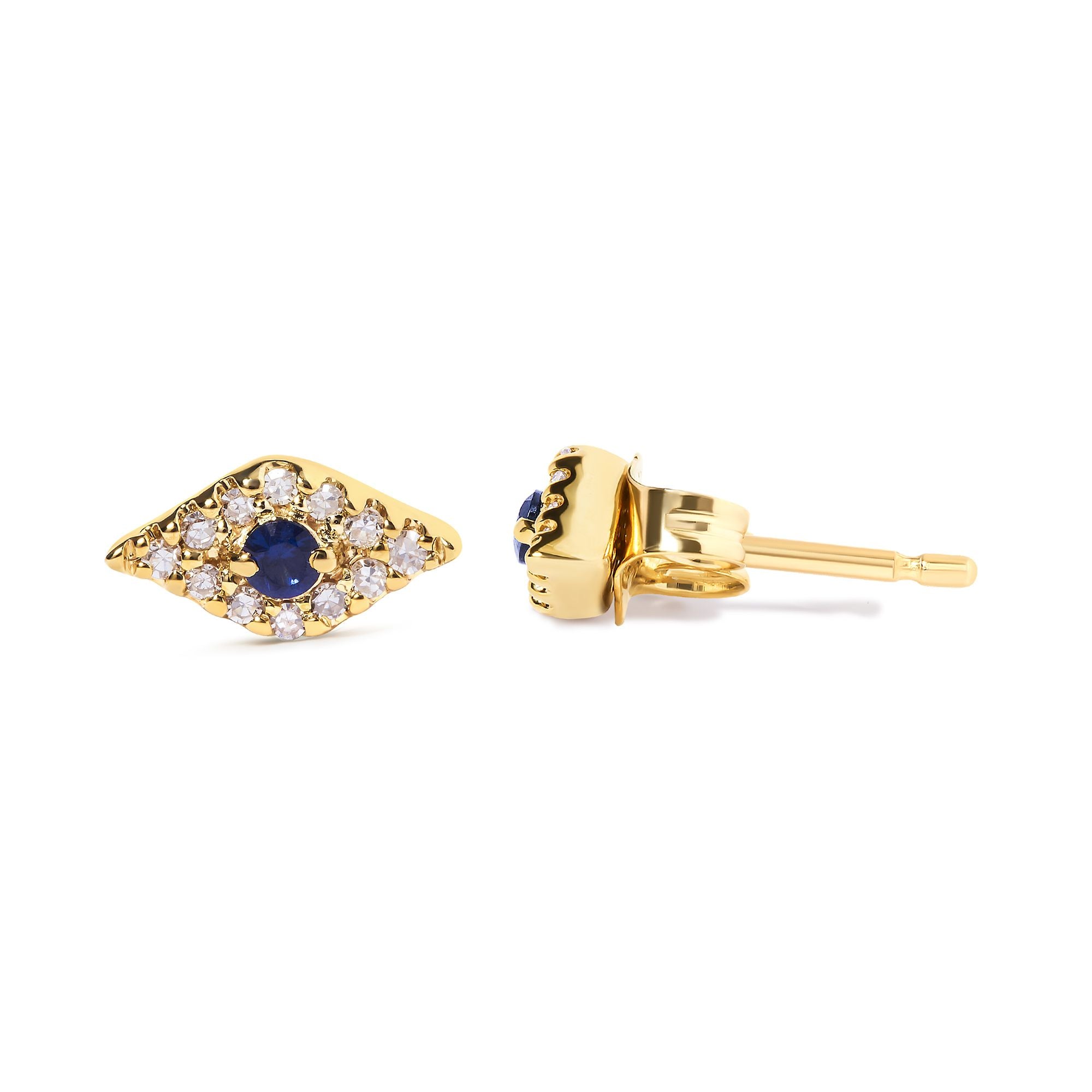 Introducing a mesmerizing piece that will captivate all who lay eyes on it. Behold the 10K Yellow Gold Evil Eye Stud Earring, adorned with a stunning Blue Sapphire and Diamond Accent. Crafted with exquisite attention to detail, this earring is a true work of art. The 24 round diamonds accented, shimmer and sparkle, enhancing the allure of the evil eye design. The H-I color of the diamonds adds a touch of brilliance, while the I1-I2 clarity ensures a mesmerizing glow. The natural blue sapphire gemstone, treated to enhance its captivating hue, measures 2 x 2 MM and is delicately set in a 2-prong setting. With a push back earring finding, this piece is both secure & comfortable to wear. Designed for women who appreciate the finer things in life, this earring exudes elegance and sophistication. Perfect for any occasion, it is a symbol of protection and style. Indulge yourself or surprise a loved one with this enchanting piece that will leave everyone spellbound.
