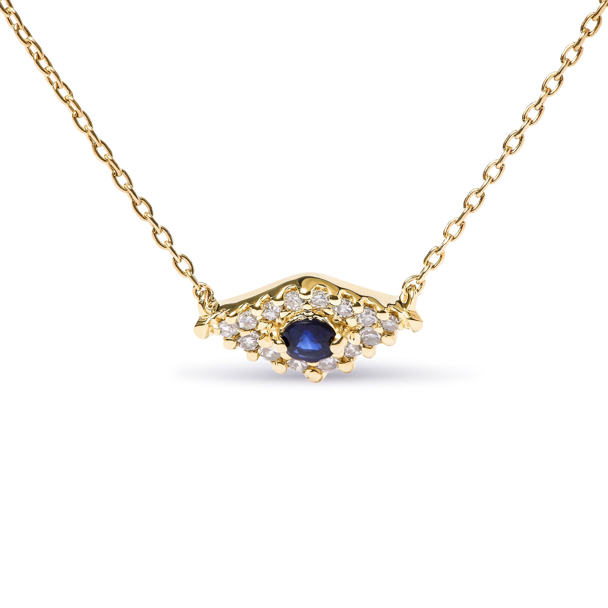 Introducing a mesmerizing masterpiece, this 10K Yellow Gold Evil Eye Pendant Necklace is a symbol of protection and beauty. Crafted with exquisite attention to detail, it features a captivating blue sapphire at its center, surrounded by 15 dazzling round diamonds. The accented diamonds are set in a pave setting, enhancing their brilliance. The 18" inch chain is secured with a spring ring clasp, ensuring a comfortable and secure fit. This necklace is designed for women who appreciate elegance and want to add a touch of glamour to their ensemble. The sapphire, treated to achieve its enchanting blue hue, measures 2.5 x 2.5 MM and is set in a 2-prong setting. The diamonds, with a color grade of H-I and clarity grade of I1-I2, add a dazzling sparkle that complements the vibrant sapphire. Indulge in this exquisite piece and channel the positive energy of the evil eye while radiating style and grace.