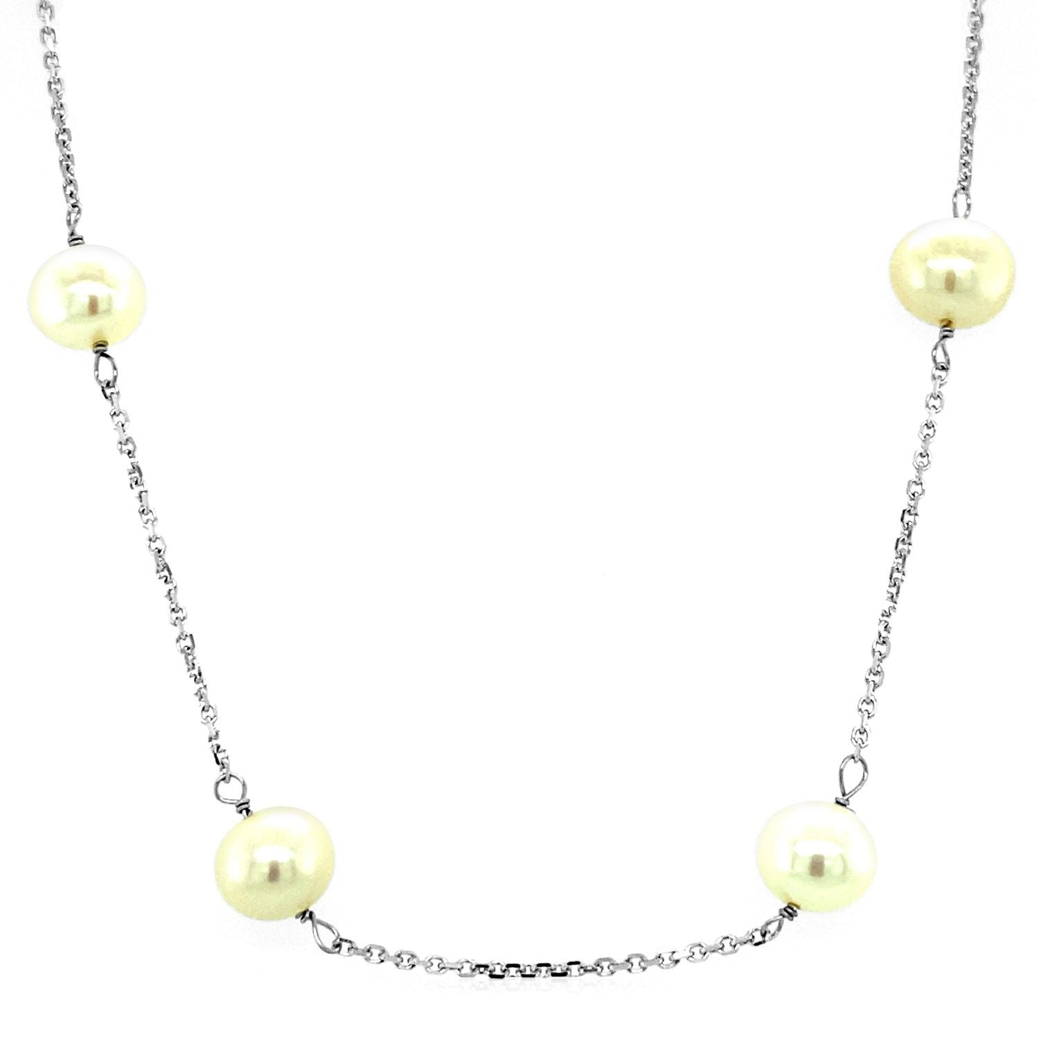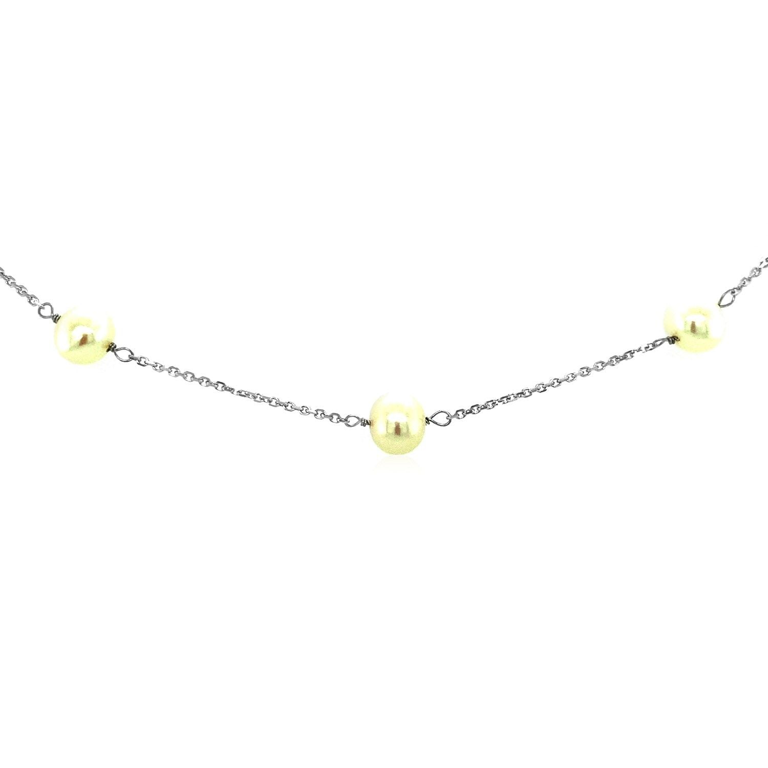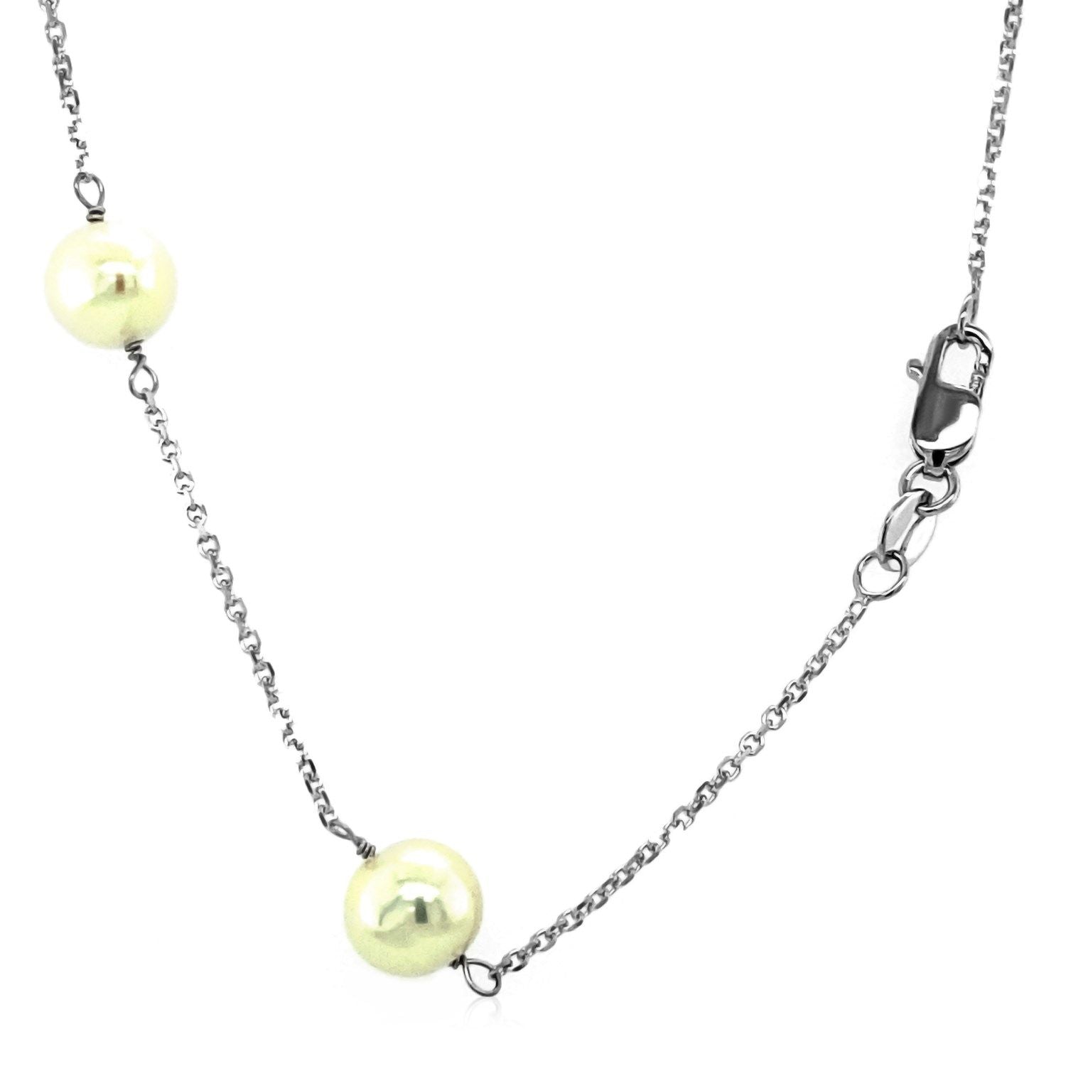 Lengths of delicate 14k white gold chain beautifully combine with classic&44; elegant white pearls to create this stunning necklace. Necklace is 16 and 18 inches long and closes with a spring ring clasp. Pearls each measure 6 to 6.5mm.
