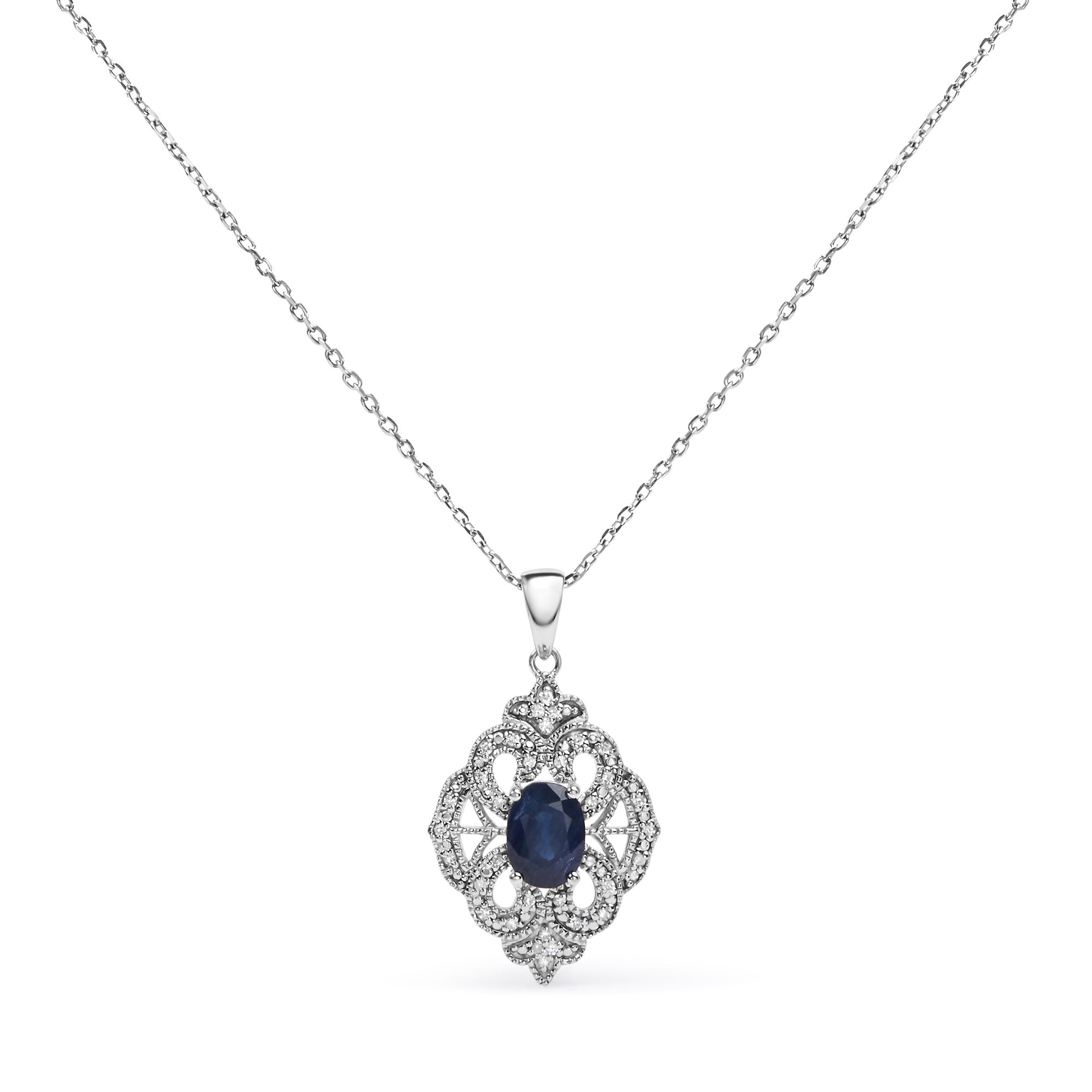 Indulge in the ethereal beauty of this Art Deco style shield-shaped pendant necklace. Crafted with .925 sterling silver, it radiates elegance and grace. Adorned with a captivating 7x5 MM oval blue sapphire and 34 dazzling diamond accents, this necklace is a true masterpiece. The natural diamonds, with a total weight of diamond accent, are expertly set in a shared prong setting, ensuring their brilliance shines through. The I-J color diamonds beautifully complement the striking blue sapphire, creating a mesmerizing contrast. The 18" cable chain, secured with a lobster claw clasp, adds a touch of sophistication. This necklace is designed to captivate and enchant, making it the perfect accessory for any occasion. The lab-created blue sapphire, with a carat weight of 1.0, boasts a stunning oval shape that exudes timeless beauty. Treat yourself or a loved one to this exquisite piece, and let its allure elevate your style.