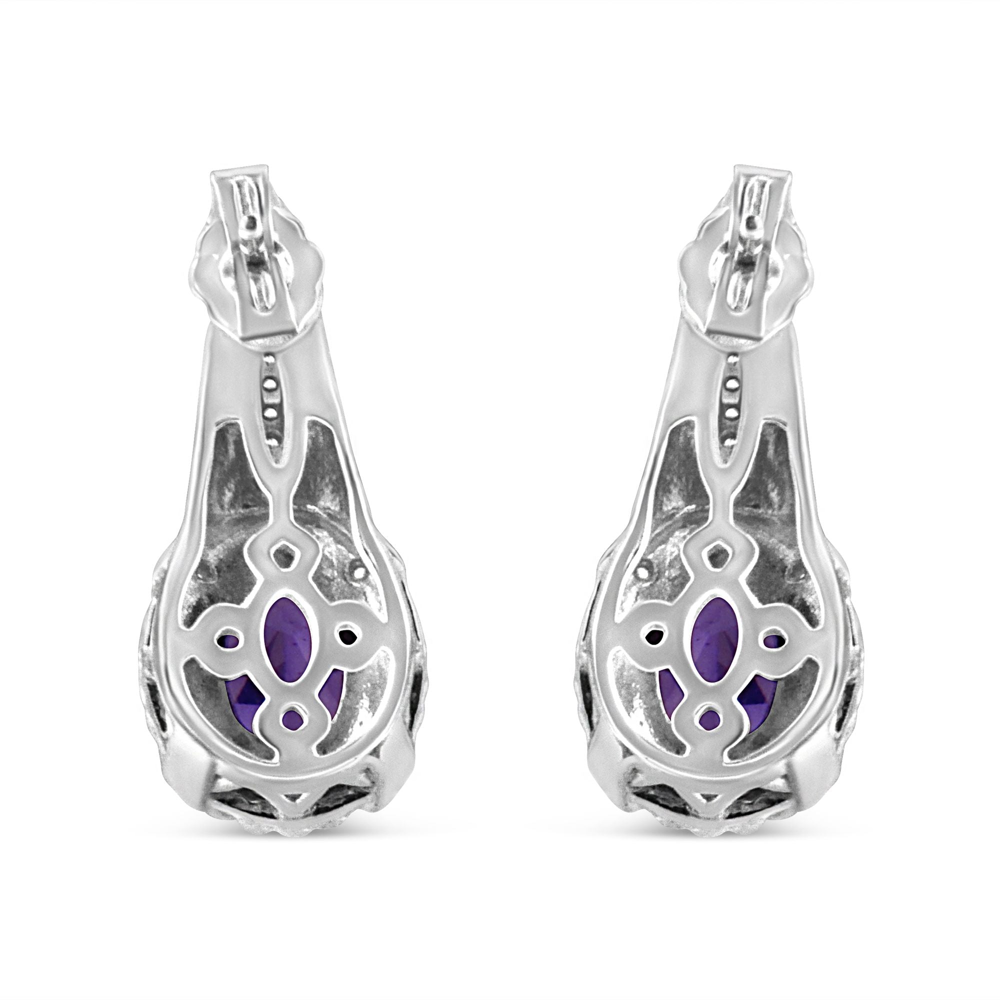These resplendent amethyst and diamond earrings captures stunning feminine grace. Fashioned in sleek sterling silver, these earrings features a centrally staged oval cut amethyst engrossed by 12 pave set shimmering single cut diamonds embellished by a bright finish rope design on the borders. These treats closes with a secure clasp. Total diamond weight is 1/20 ctw and each amethyst measures 8x6 mm.