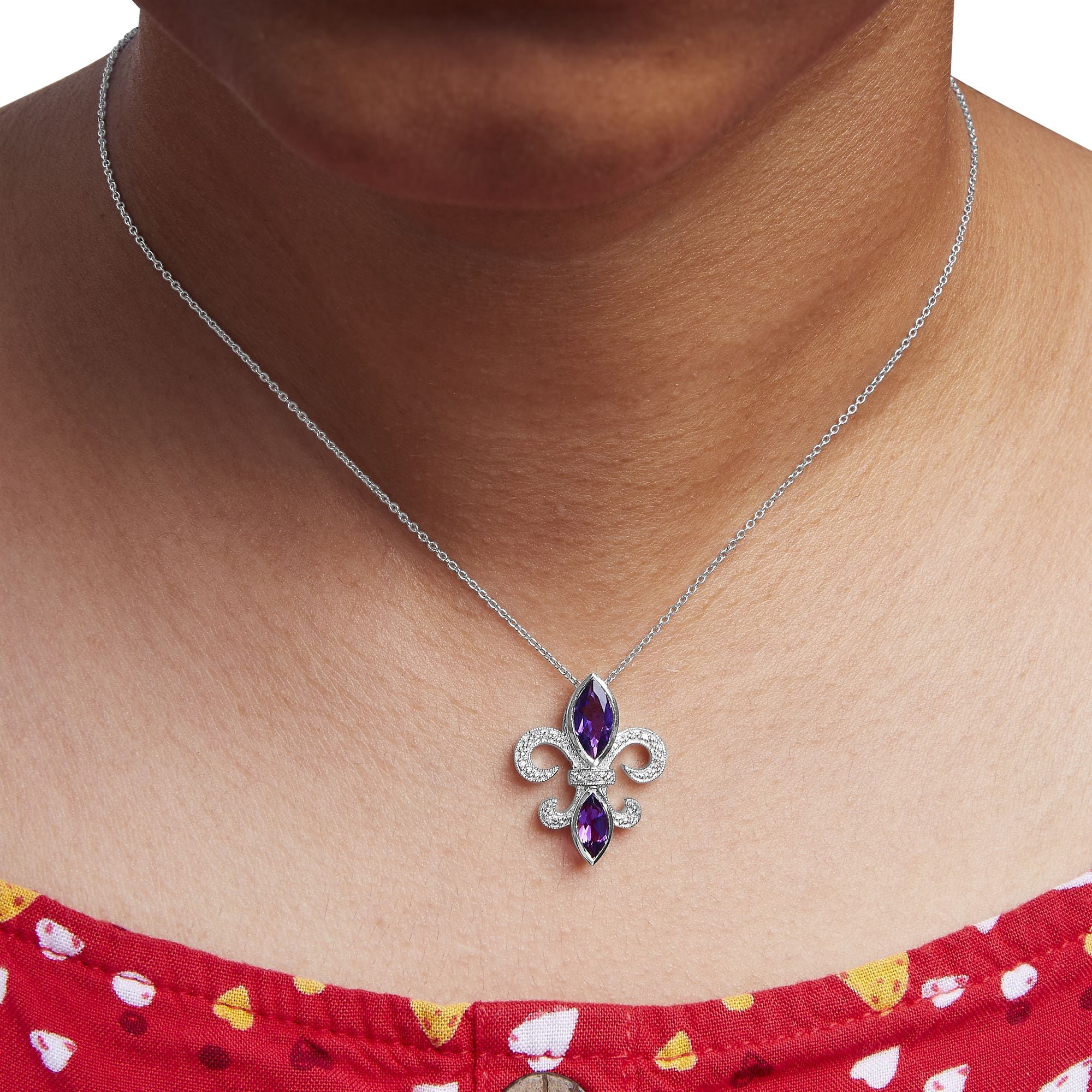 Indulge in the captivating allure of this exquisite pendant necklace. Crafted from .925 sterling silver, it showcases a marquise-shaped purple amethyst gemstone, radiating elegance and charm. Adorned with a delicate fleur de lis design, this necklace is further enhanced by seven dazzling round diamonds. The natural diamonds, with H-I color and SI1-SI2 clarity, are expertly set in a prong setting to maximize their brilliance. With a size of 18 inches, this necklace is perfect for women who appreciate timeless beauty. The amethyst gemstone, heat treated for enhanced color, measures 8 x 4 and 9 x 5 mm, and is securely bezel-set. Finished with a spring ring clasp, this necklace ensures both style and convenience. Elevate your jewelry collection with this captivating pendant necklace, a true testament to your refined taste.